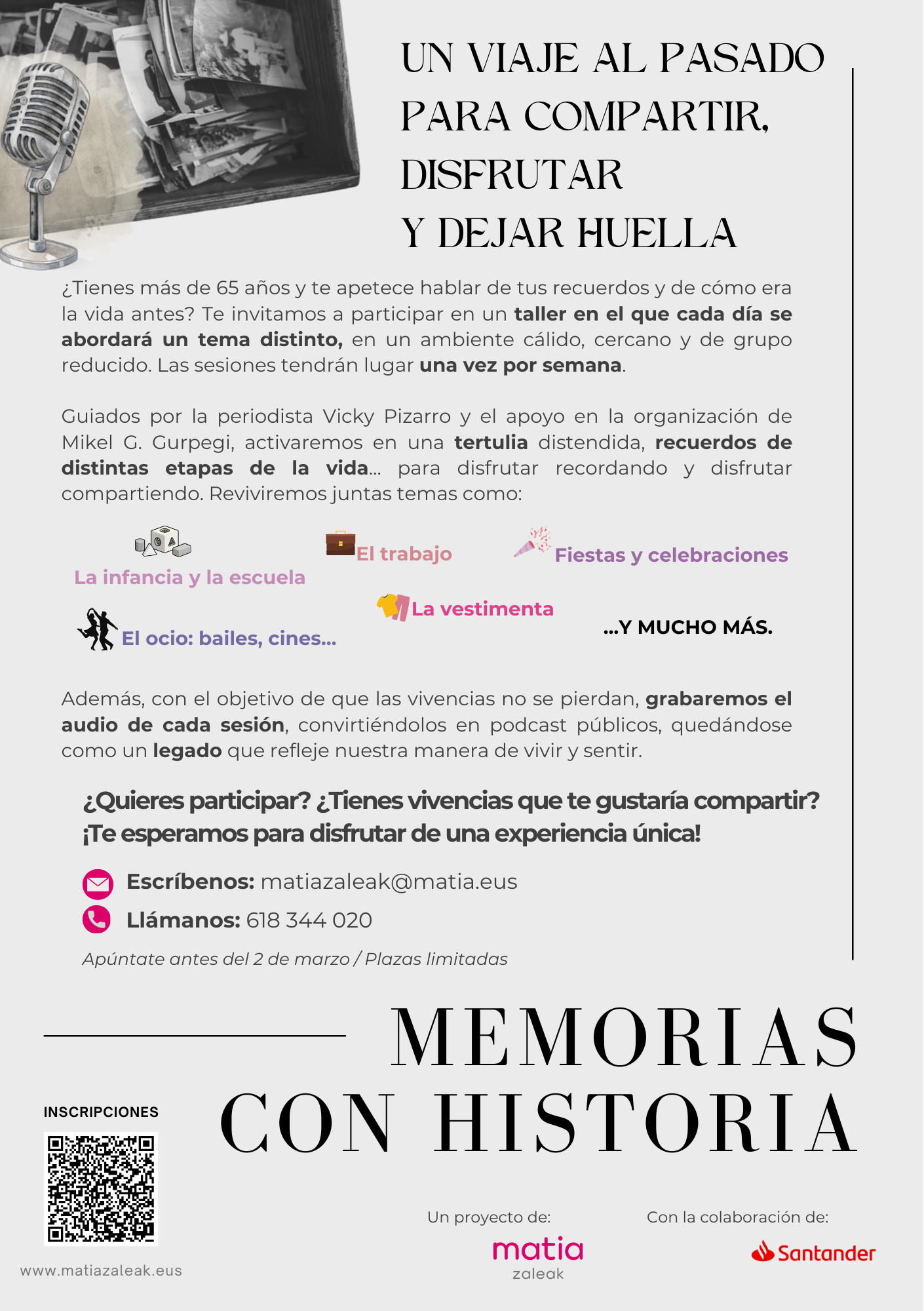 Es una iniciativa que empezará con unos talleres compuestos por personas mayores. Talleres y coloquios que irán guiados por una persona especialista, que irá activando recuerdos de su pasado, recuerdos de diferentes etapas de su vida, de cómo se vivía, sobre el trabajo, las celebraciones, la infancia... diferentes temáticas que recorren su vida y activan y refrescan sus recuerdos. El grupo participará en 10 talleres temáticos.